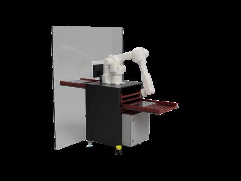 Die Zelle bestehet im Grunde genommen aus zwei Hauptkomponenten. Einem Roboter von Kawasaki und einem Tisch, in dem jegliche Technik Platz findet und die zu bearbeitenden / die bearbeiteten Werkstücke Platz finden. Durch die Anschrägung des oberen Aufbau des Tisches und den eigens von uns entwickelten Positionierungsstreben, die über die Länge des Tisches gelegt werden können, werden die Werkstücke in Position gebracht, sodass der Roboter weiß, wo er greifen muss. Die Positionierungsstreben sind flexibel in der Höhe und auch in ihrer Größe, sodass sie individuell an die Größe der Werkstücke anpassbar sind. So können unterschiedlichste Werkstückgeometrien mit kurzer Rüstzeit realisiert werden. Die von dem System benötigten Informationen können über ein Touch Panel PC, der außen an der Zelle angebracht ist, eingegeben werden.
